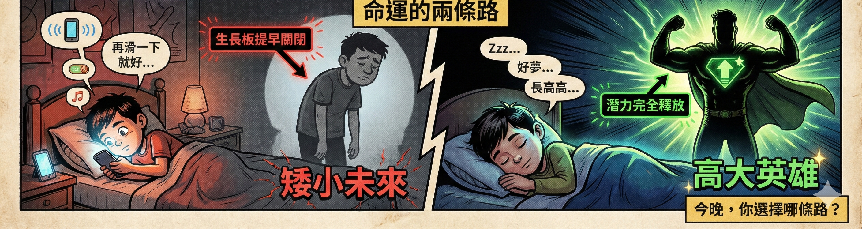 當孩子長期晚睡,或是睡在有光線的環境(包含小夜燈、或是窗外透進來的路燈),體內的褪黑激素濃度就會不足。這時候,原本被壓抑的性荷爾蒙就會逮到機會開始作亂,導致「性早熟」發生。性早熟最可怕的後果,就是會讓骨齡快速超前,雖然孩子現在看起來比同學高,但那是透支未來的身高,一旦生長板因荷爾蒙刺激而提早閉合,孩子最終的成人身高往往會不如預期,甚至這輩子都長不到了。